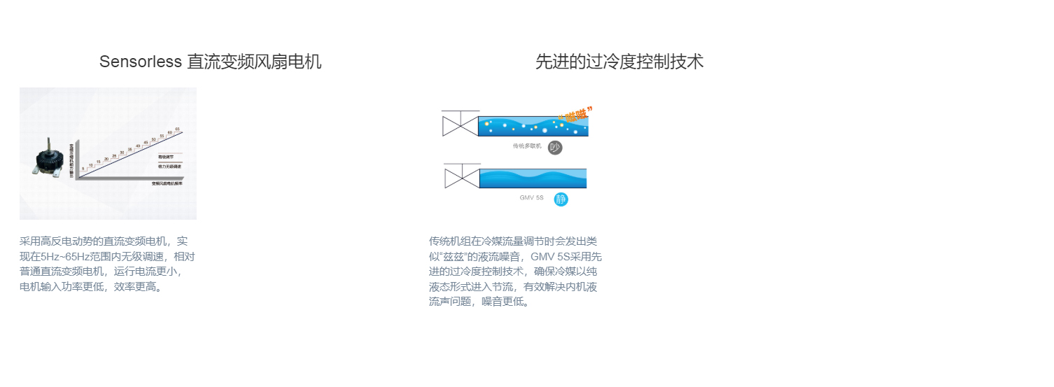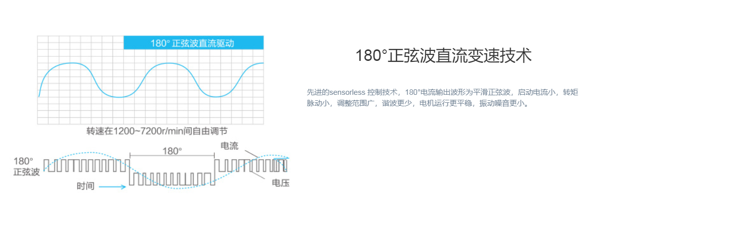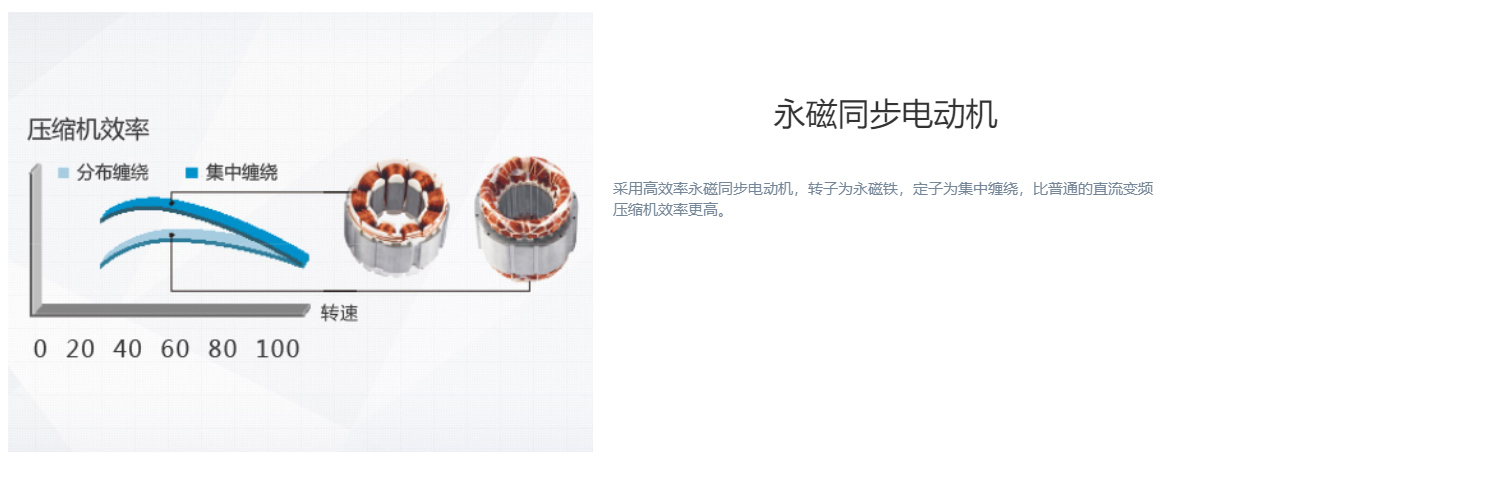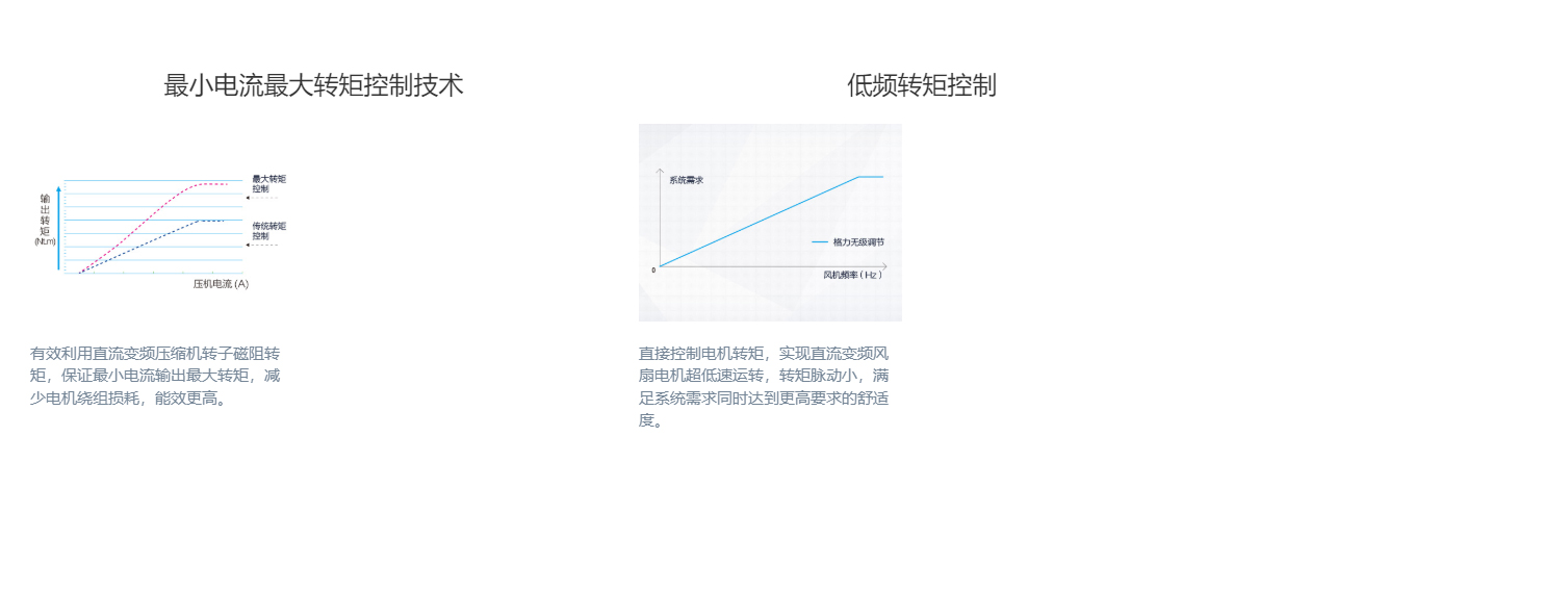 全直流變頻技術(shù)、永磁同步電機(jī)、直流變頻壓縮機(jī)、過(guò)冷度控制技術(shù)、180°正弦波直流變頻技術(shù)、雙節(jié)能運(yùn)行模式、制熱不換向回油