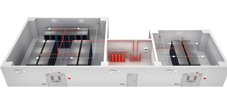 機(jī)房消防報(bào)警及滅火系統(tǒng)采用有管網(wǎng)全淹沒(méi)方式,并采用氣體滅火劑,探測(cè)器配置方式為智能感煙探測(cè)器、智能感溫探測(cè)器搭配,只有兩種探測(cè)器同時(shí)報(bào)警,氣體滅火系統(tǒng)才會(huì)發(fā)生聯(lián)動(dòng),同時(shí)還設(shè)有遠(yuǎn)程手動(dòng)啟動(dòng)及機(jī)械手動(dòng)方式。
