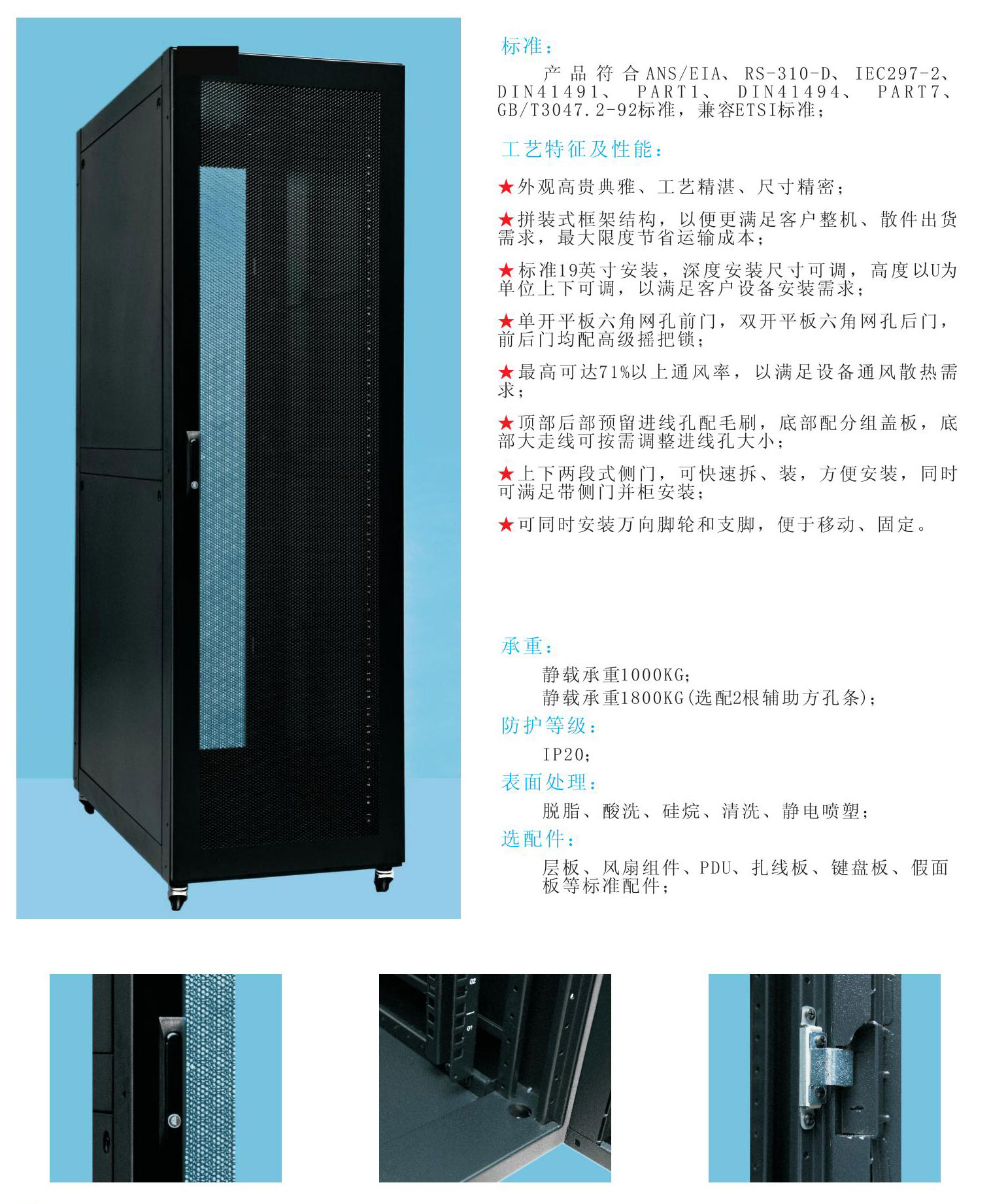 ★ 單開(kāi)平板六角網(wǎng)孔前門,雙開(kāi)平板六角網(wǎng)孔后門,前后門均配高級(jí)搖把鎖;